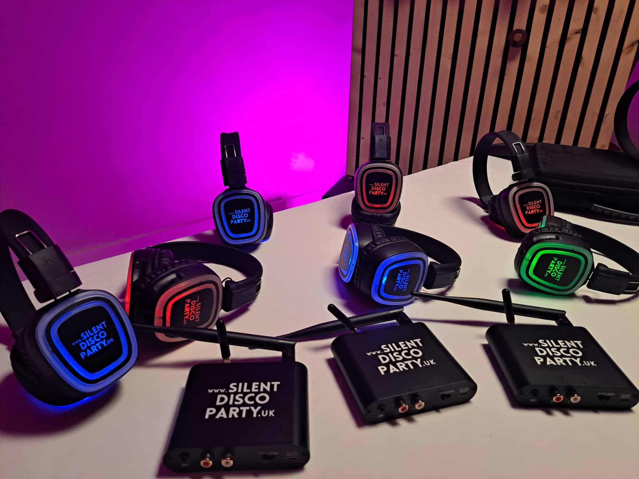 Hire our amazing 3 channel LED silent disco headphones. All the equipment you need to host a silent disco including headphones, 3 transmitters, cables, Spotify playlists & next day DPD delivery.
