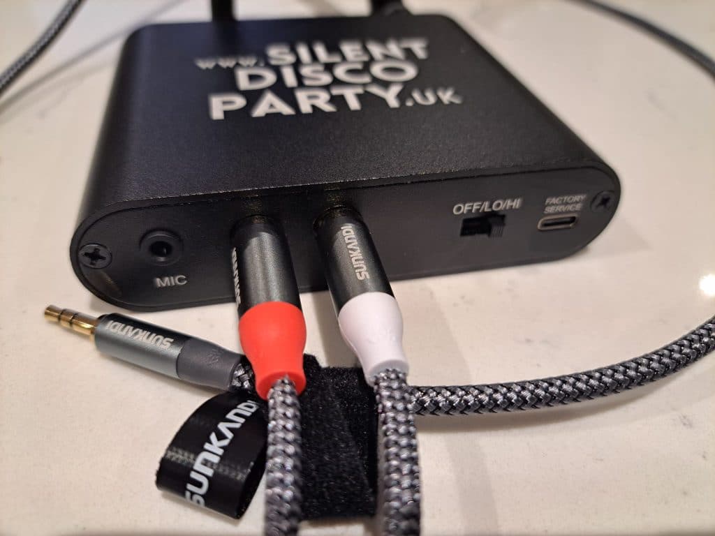 Power on the transmitters, connect your audio devices, turn the headphones on and you have a silent disco!